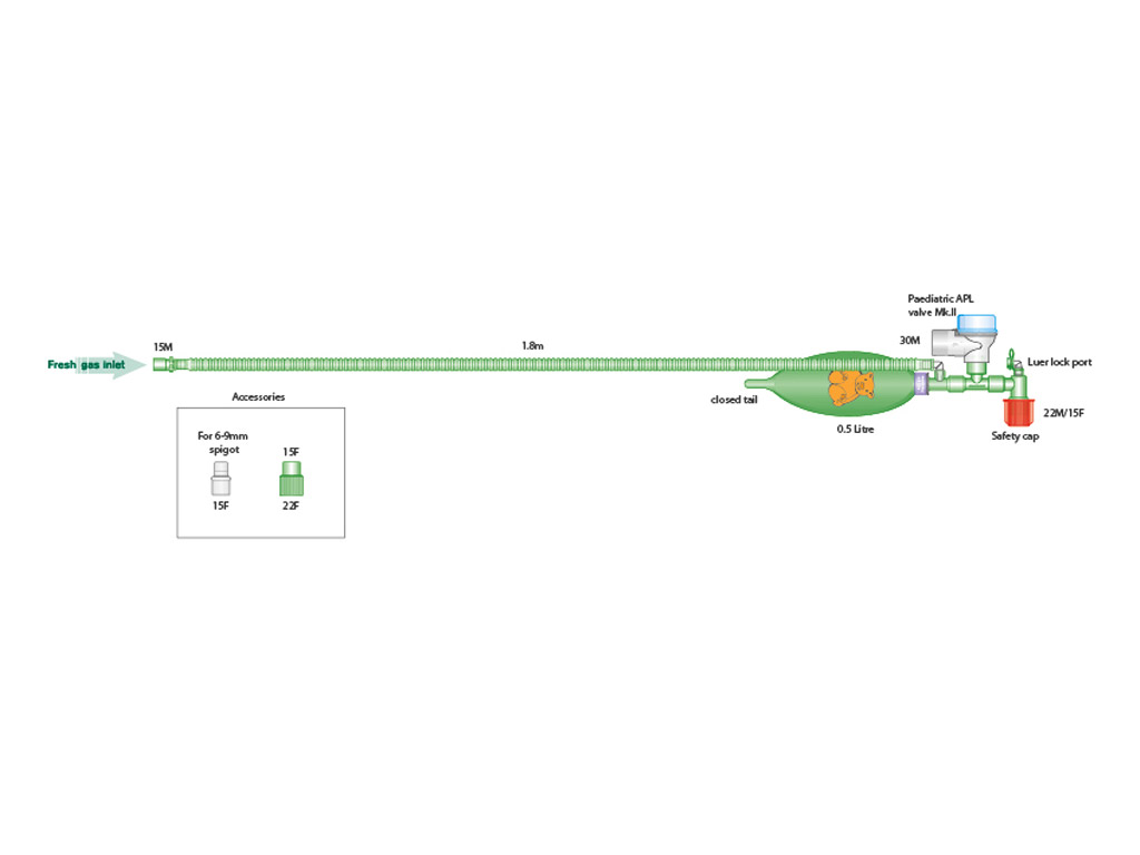 CIRCUITO ANESTESIA PEDIATRICO, con PALLONE di VENTILAZIONE CHIUSO da 0,5 Lt lunghezza 1.8 MT. Circuito per rianimazione pediatrico che comprende un raccordo a gomito per il monitoraggio della CO2 al lato paziente per la campionatura diretta.